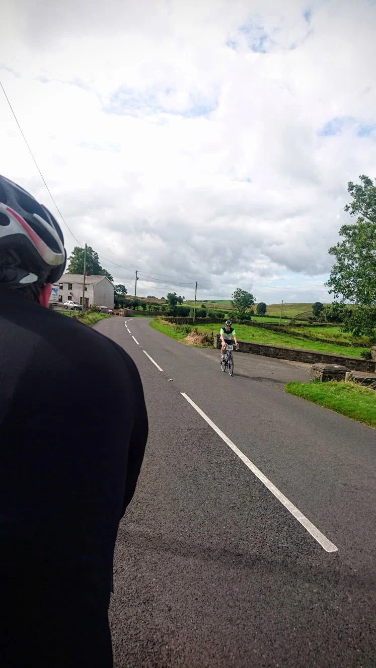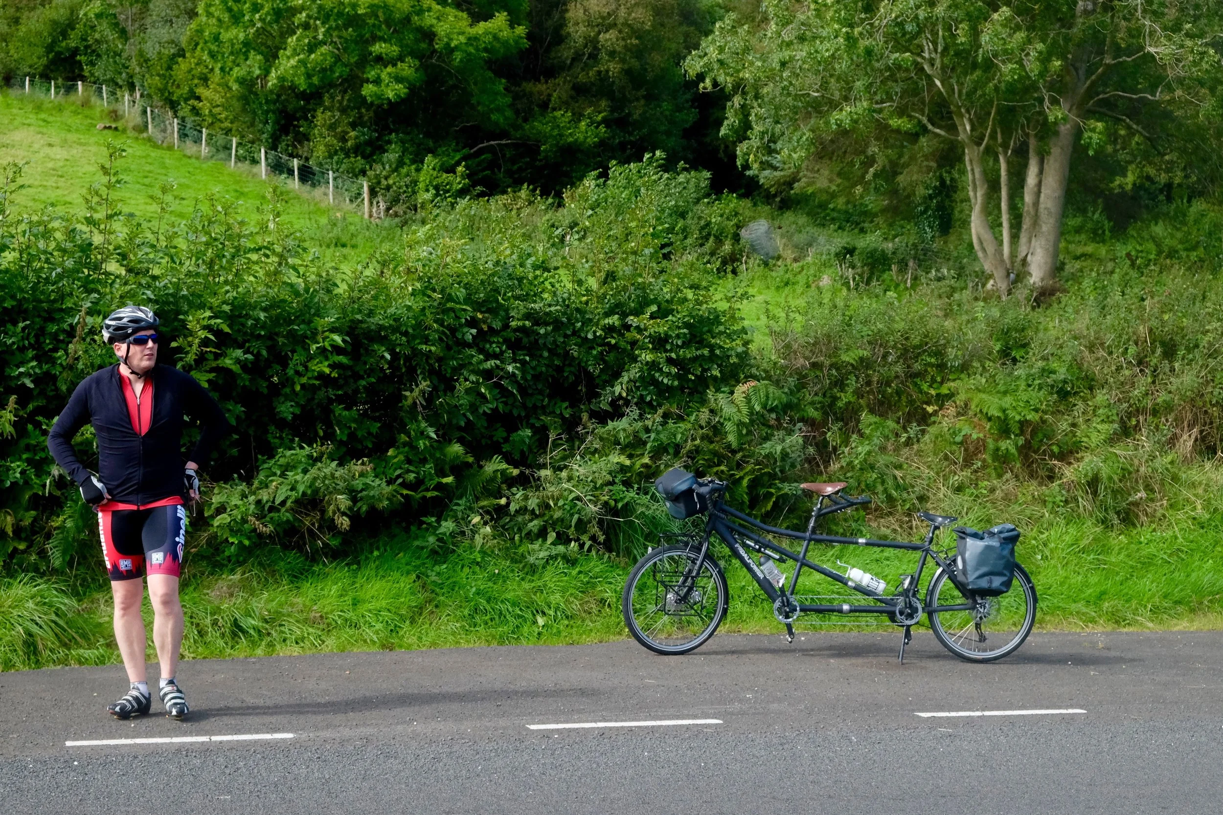 There were cyclists of all shapes and sizes streaking past us in their finest kit in defined groups, single file, and occasionally the odd loner. Hundreds of them flew downhill in fine fashion, looking focused and determined to keep up their cadence. Yet, no one could resist cracking a smile at the sight of us loonies huffing and puffing our way uphill on our tandem.