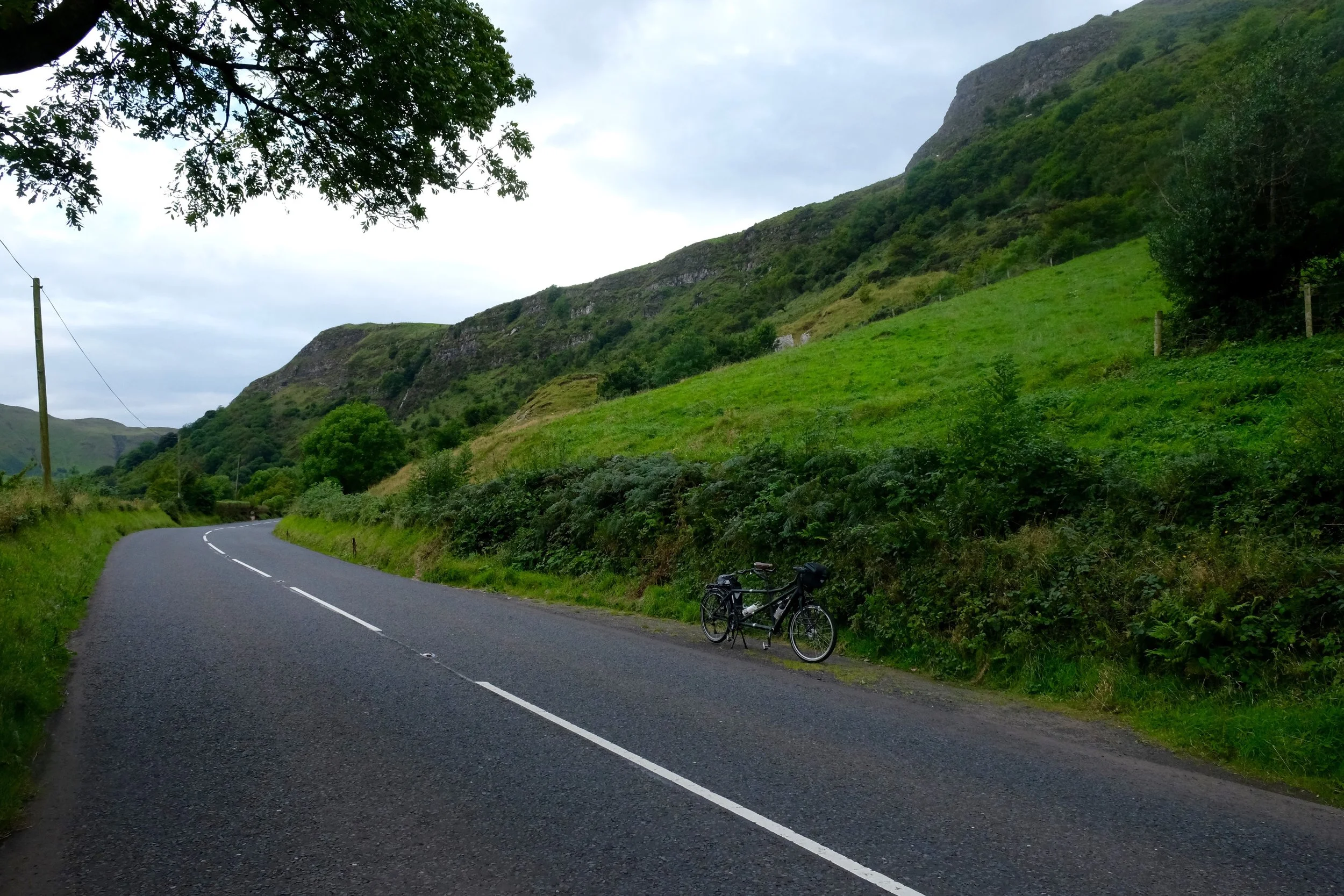 After finding it in us somehow to get back in the saddle, we set off towards Waterfoot along the coast. Our plan was to ride through Glenariff Forest Park, but we lost an hour visiting a bike mechanic we happened upon along the way to see if he could do anything about our dodgy gear shifter, which by this point had stopped working once again. He tried valiantly but was as stymied as we had been earlier. So like yesterday's trip, we were stuck in an in-between single speed gear that would see us to our final destination, but had to be straightened out again before we set off tomorrow.