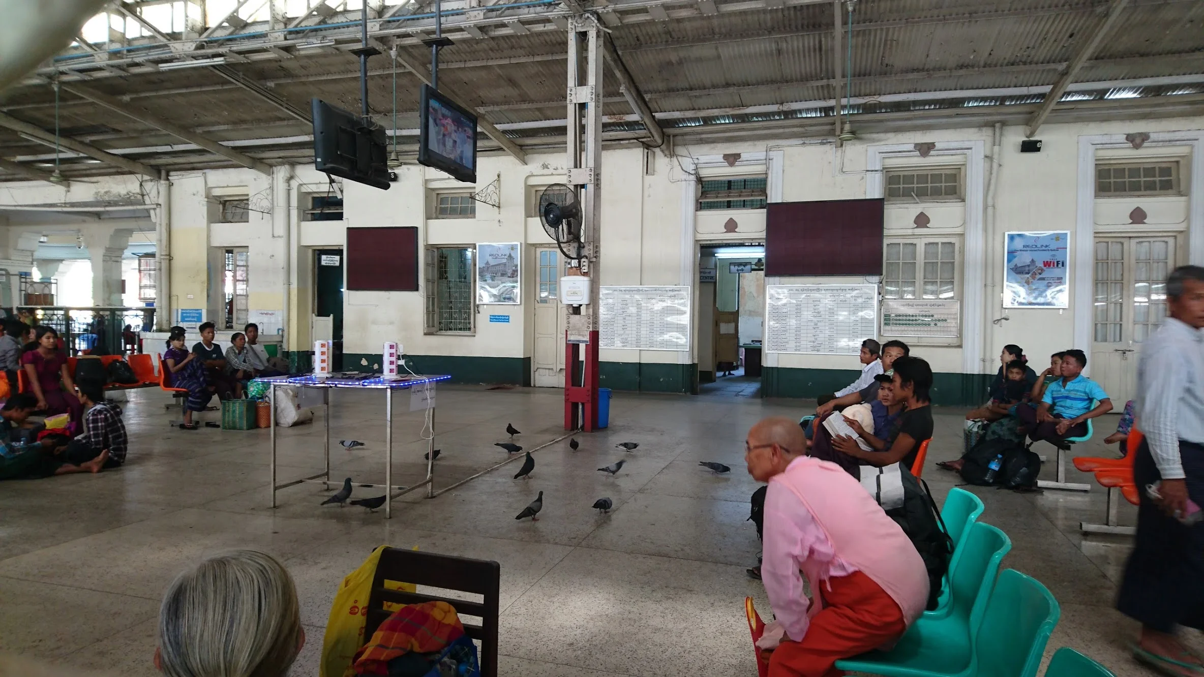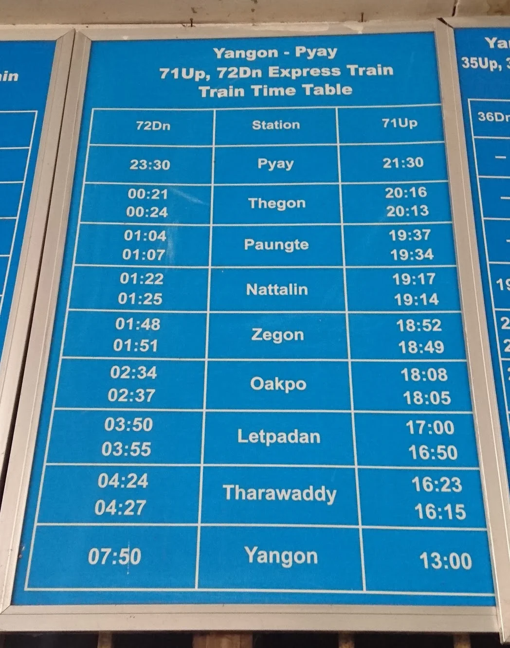 The "up" and "down" are quaint throwbacks to the British colonial origins of the railway. Trains go "up" to Yangon, and "down" from it.