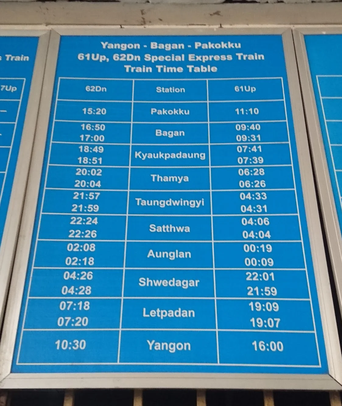 Behold - somewhat reliable itineraries for the Yangon - Pyay and Yangon - Bagan lines: