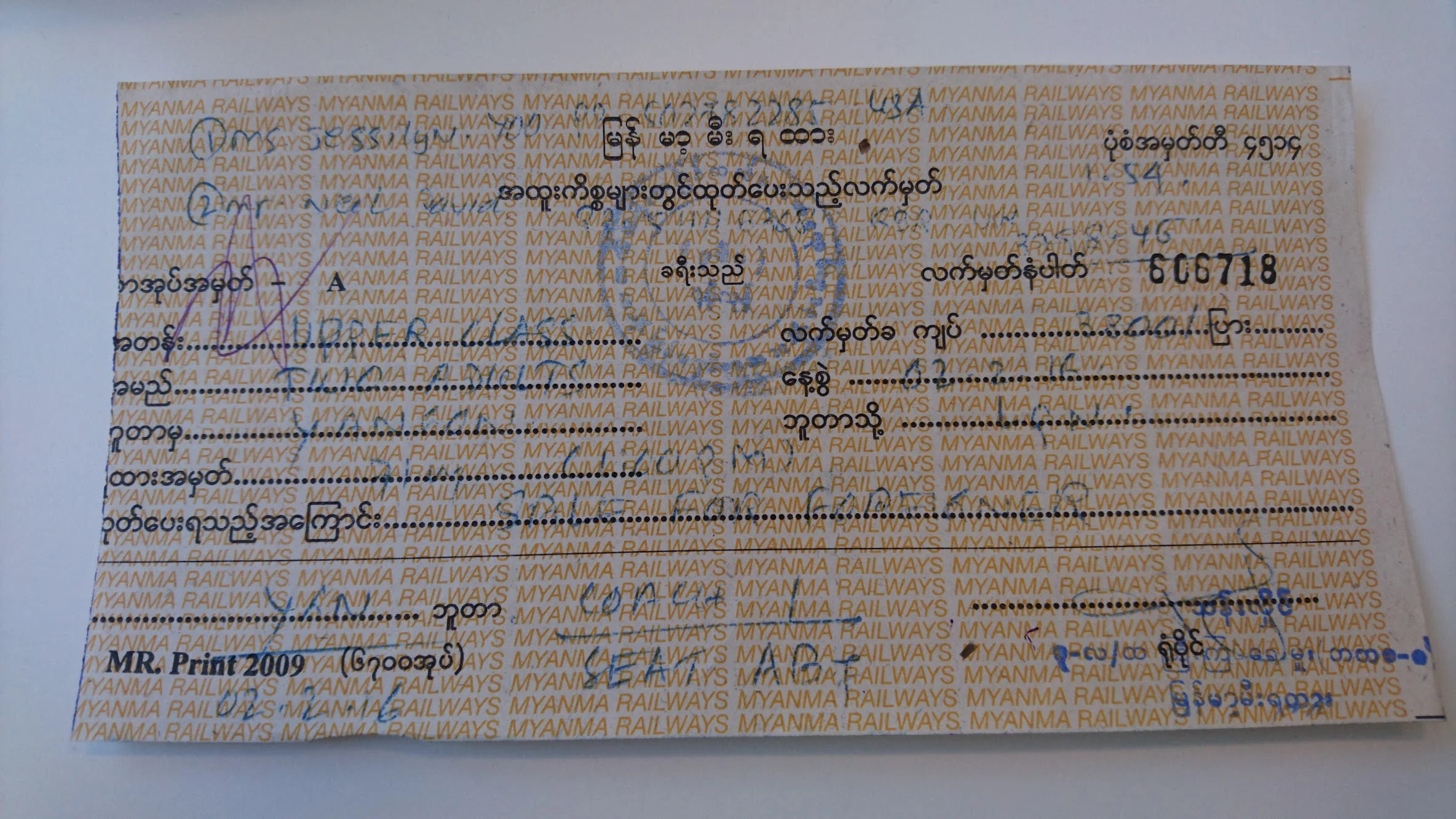 As of April 2014, foreigners can pay for tickets in kyat, so there's no need to panic in case you don't have any U.S. dollars. In fact, so far this trip, we haven't had to pay in dollars at all. Another major change since the days of yore. Additionally, unless you specify the class you wish to sit in, they will automatically give you an upper class (read: more expensive at 1,900 kyat per person) ticket because of your "special status" as a tourist. Admittedly, the seats are a bit more comfortable (cushioned and reclining vs. hard wooden benches), but it's up to yourself whether you want to pay 40% more for it.